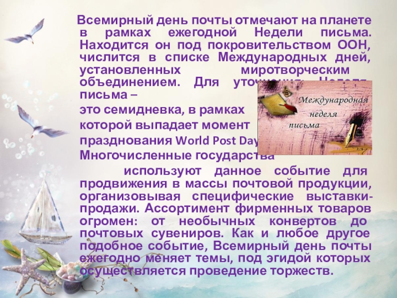 Недели письма. Находится он под покровительством ООН, числится в списке Международных дней, установленных миротворческим объединением. Для уточнения: Неделя письма –