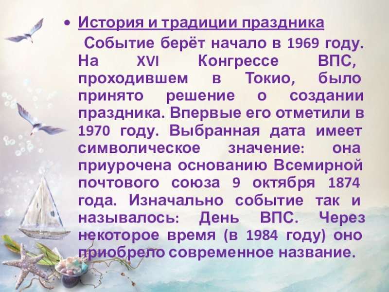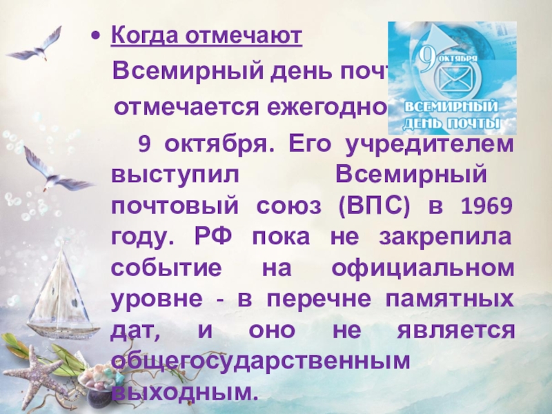 Слайд 12 Всемирный день почты отмечают на планете в рамках ежегодной