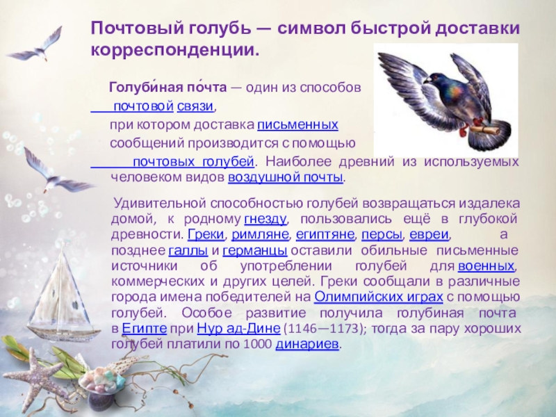 Слайд 7Почтовый голубь — символ быстрой доставки корреспонденции.