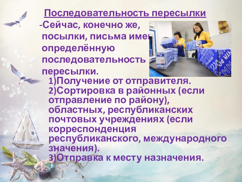 2)Сортировка в районных (если отправление по району), областных, республиканских почтовых учреждениях (если корреспонденция республиканского, международного значения).