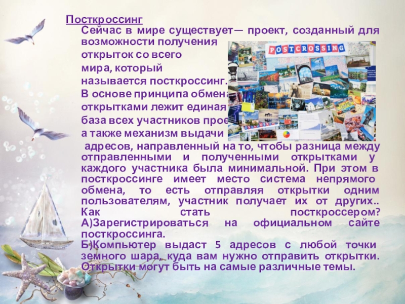 адресов, направленный на то, чтобы разница между отправленными и полученными открытками у каждого участника была минимальной. При этом в посткроссинге имеет место система непрямого обмена, то есть отправляя открытки одним пользователям, участник получает их от других..