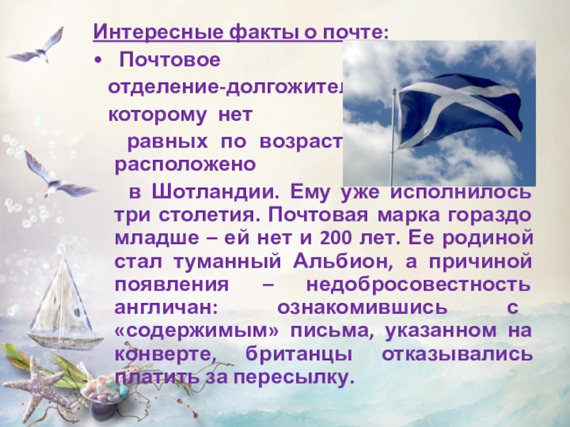 в Шотландии. Ему уже исполнилось три столетия. Почтовая марка гораздо младше – ей нет и 200 лет. Ее родиной стал туманный Альбион, а причиной появления – недобросовестность англичан: ознакомившись с «содержимым» письма, указанном на конверте, британцы отказывались платить за пересылку.