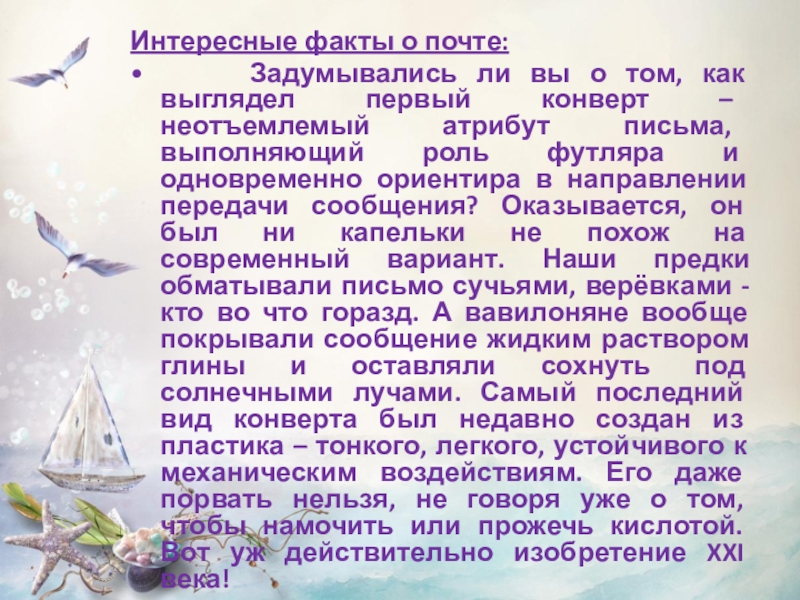 том, как выглядел первый конверт – неотъемлемый атрибут письма, выполняющий роль футляра и одновременно ориентира в направлении передачи сообщения? Оказывается, он был ни капельки не похож на современный вариант. Наши предки обматывали письмо сучьями, верёвками - кто во что горазд. А вавилоняне вообще покрывали сообщение жидким раствором глины и оставляли сохнуть под солнечными лучами. Самый последний вид конверта был недавно создан из пластика – тонкого, легкого, устойчивого к механическим воздействиям. Его даже порвать нельзя, не говоря уже о том, чтобы намочить или прожечь кислотой. Вот уж действительно изобретение XXI века!
