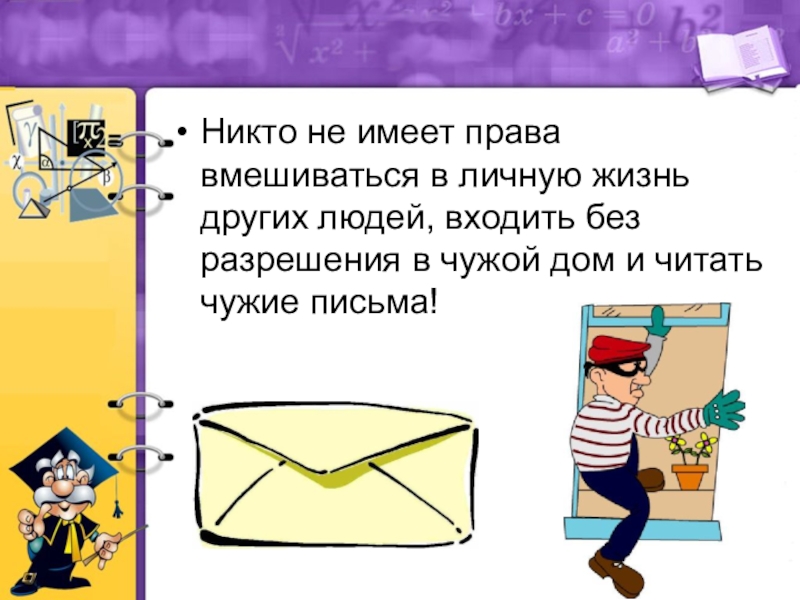 Слайд 8Никто не имеет права вмешиваться в личную жизнь других людей, входить