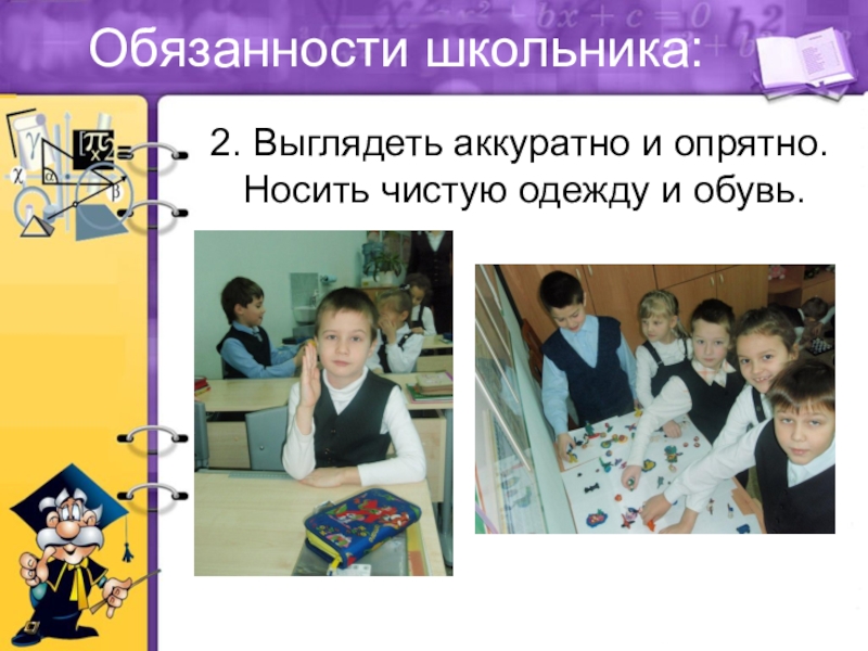 Обязанности школьника:2. Выглядеть аккуратно и опрятно. Носить чистую одежду и обувь.