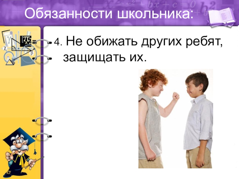 Обязанности школьника:4. Не обижать других ребят, защищать их.