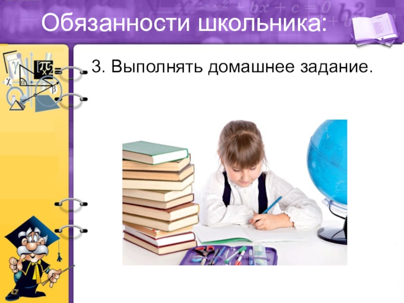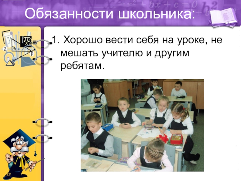 1. Хорошо вести себя на уроке, не мешать учителю и другим ребятам.Обязанности школьника: