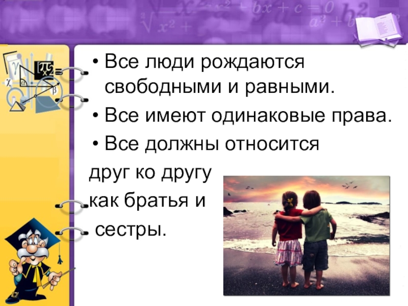 Все люди рождаются свободными и равными. Все имеют одинаковые права. Все должны относится друг ко другу как
