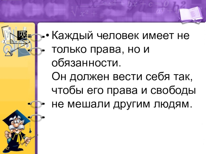Каждый человек имеет не только права, но и обязанности. Он должен вести себя так, чтобы его права