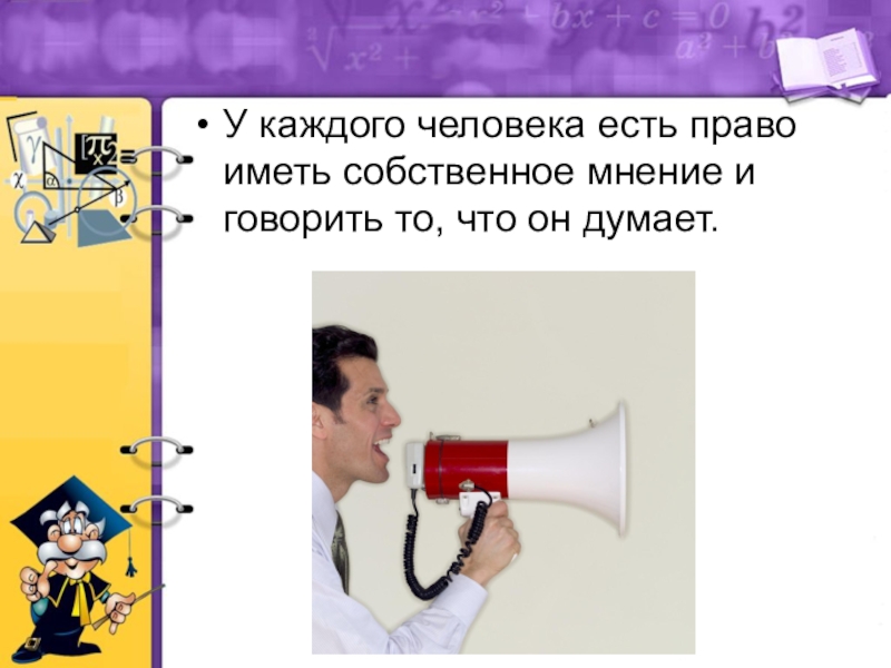 Слайд 7У каждого человека есть право иметь собственное мнение и говорить то,