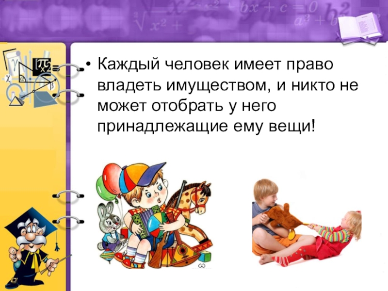 Слайд 9Каждый человек имеет право владеть имуществом, и никто не может отобрать