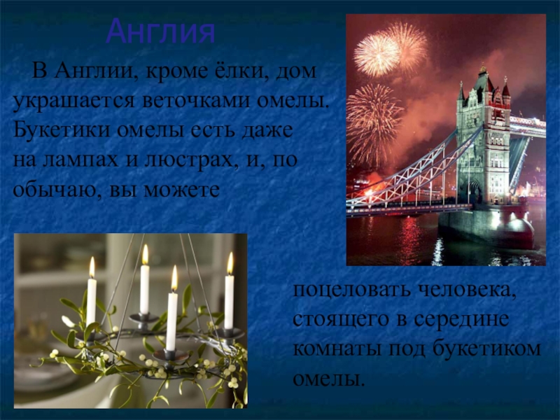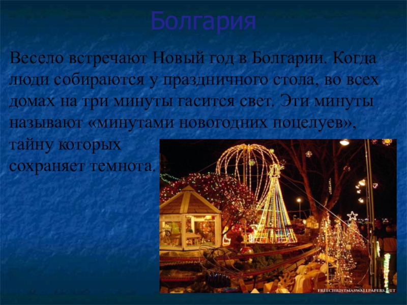 стола, во всех домах на три минуты гасится свет. Эти минуты называют «минутами новогодних поцелуев», тайну которых