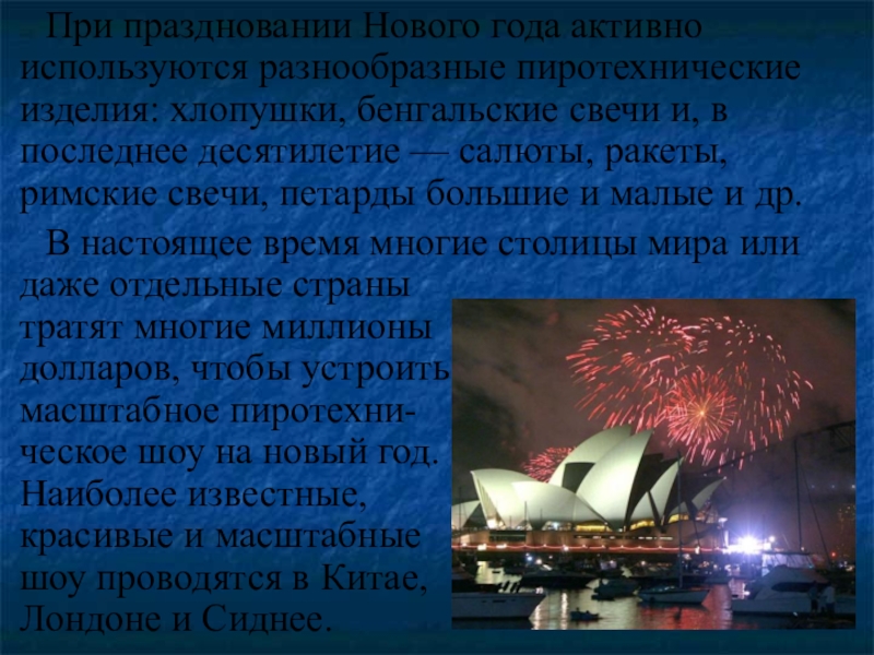 Слайд 21 При праздновании Нового года активно используются разнообразные пиротехнические