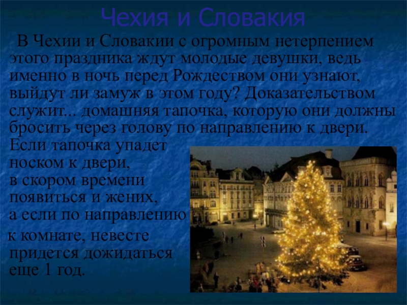 нетерпением этого праздника ждут молодые девушки, ведь именно в ночь перед Рождеством они узнают, выйдут ли замуж в этом году? Доказательством служит... домашняя тапочка, которую они должны бросить через голову по направлению к двери. Если тапочка упадет