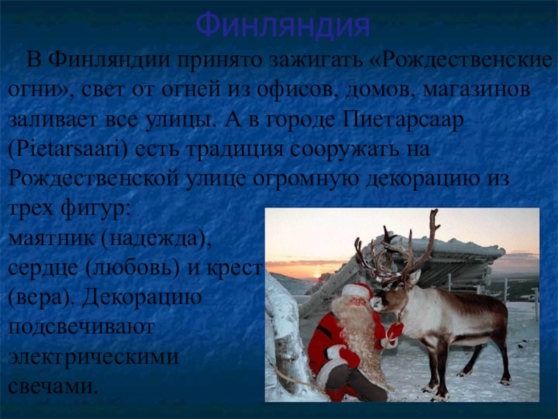 «Рождественские огни», свет от огней из офисов, домов, магазинов заливает все улицы. А в городе Пиетарсаар (Pietarsaari) есть традиция сооружать на Рождественской улице огромную декорацию из