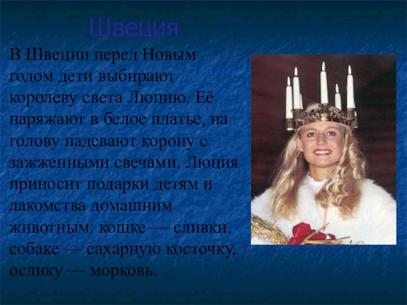 В Швеции перед Новым годом дети выбирают королеву света Люцию. Её