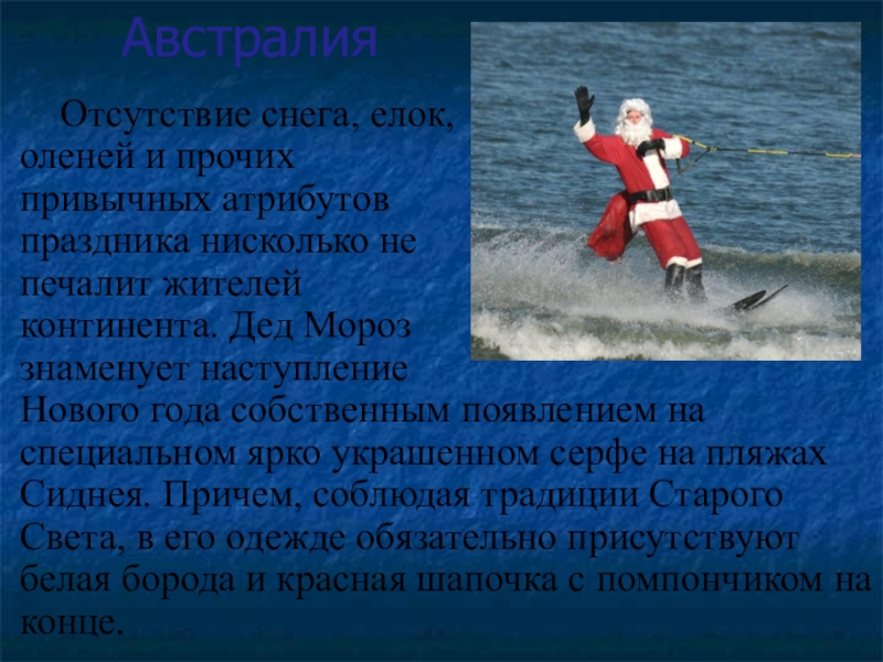 Нового года собственным появлением на специальном ярко украшенном серфе на пляжах Сиднея. Причем, соблюдая традиции Старого Света, в его одежде обязательно присутствуют белая борода и красная шапочка с помпончиком на конце.
