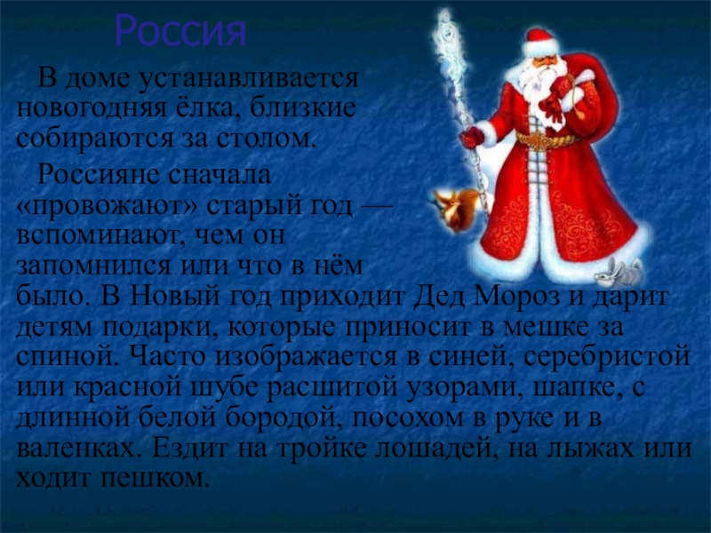 было. В Новый год приходит Дед Мороз и дарит детям подарки, которые приносит в мешке за спиной. Часто изображается в синей, серебристой или красной шубе расшитой узорами, шапке, с длинной белой бородой, посохом в руке и в валенках. Ездит на тройке лошадей, на лыжах или ходит пешком.