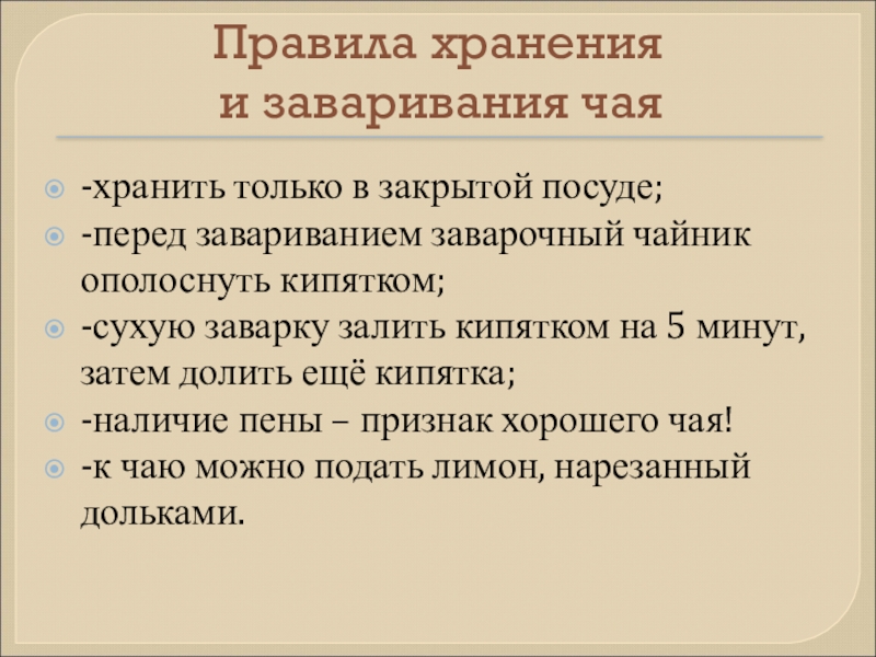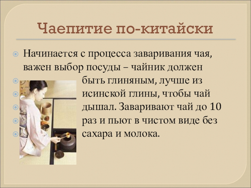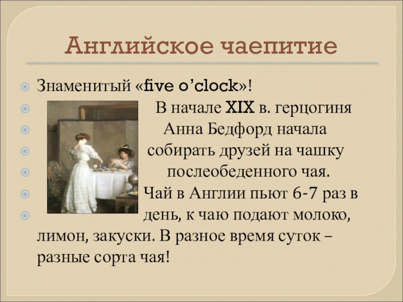 день, к чаю подают молоко, лимон, закуски. В разное время суток – разные сорта чая!