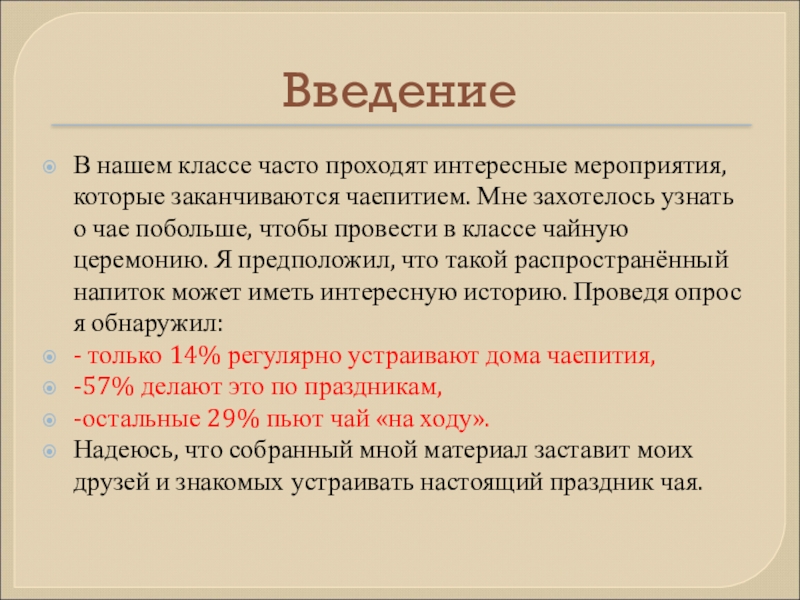 захотелось узнать о чае побольше, чтобы провести в классе чайную церемонию. Я предположил, что такой распространённый напиток может иметь интересную историю. Проведя опрос я обнаружил: