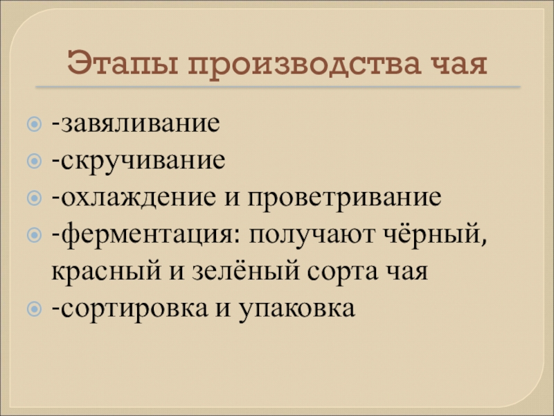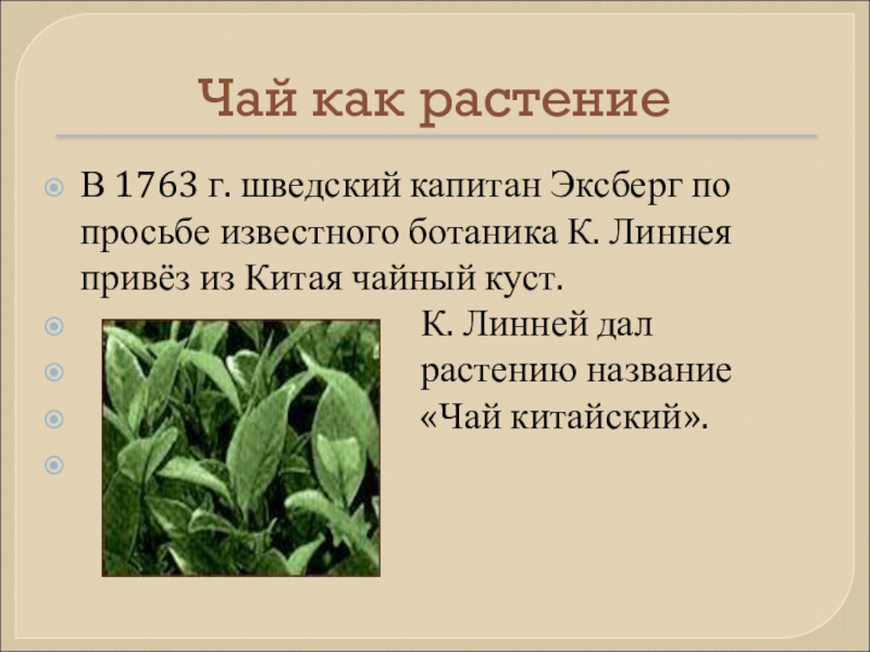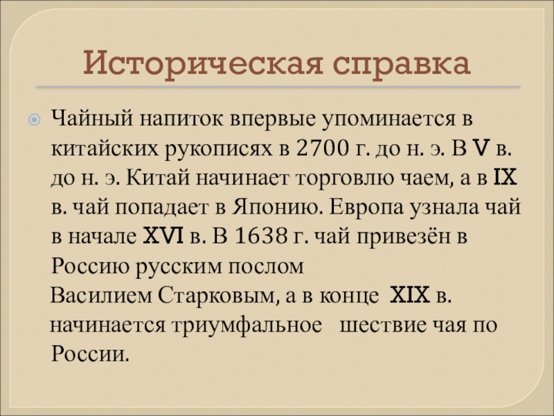 до н. э. В V в. до н. э. Китай начинает торговлю чаем, а в IX в. чай попадает в Японию. Европа узнала чай в начале XVI в. В 1638 г. чай привезён в Россию русским послом