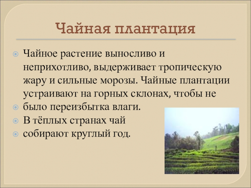Чайное растение выносливо и неприхотливо, выдерживает тропическую жару и сильные
