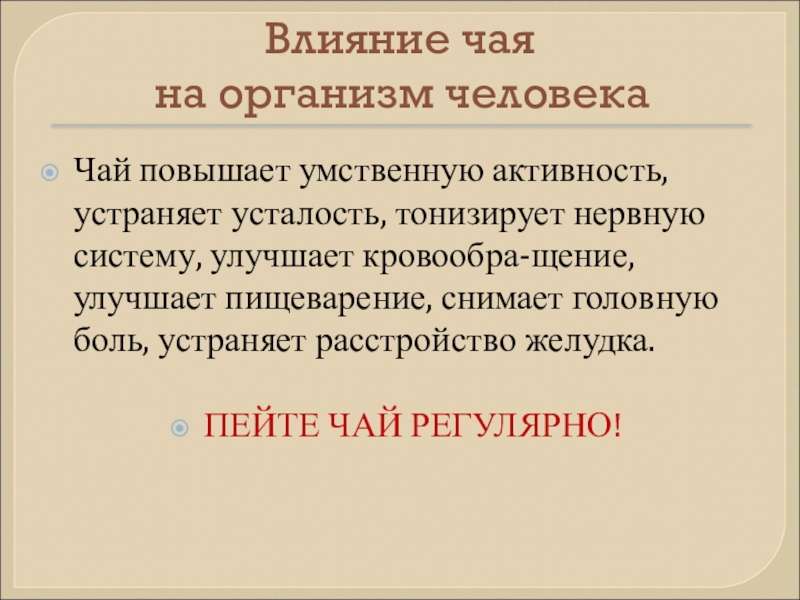 Чай повышает умственную активность, устраняет усталость, тонизирует