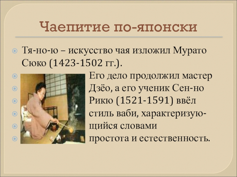 Тя-но-ю – искусство чая изложил Мурато Сюко (1423-1502 гг.).