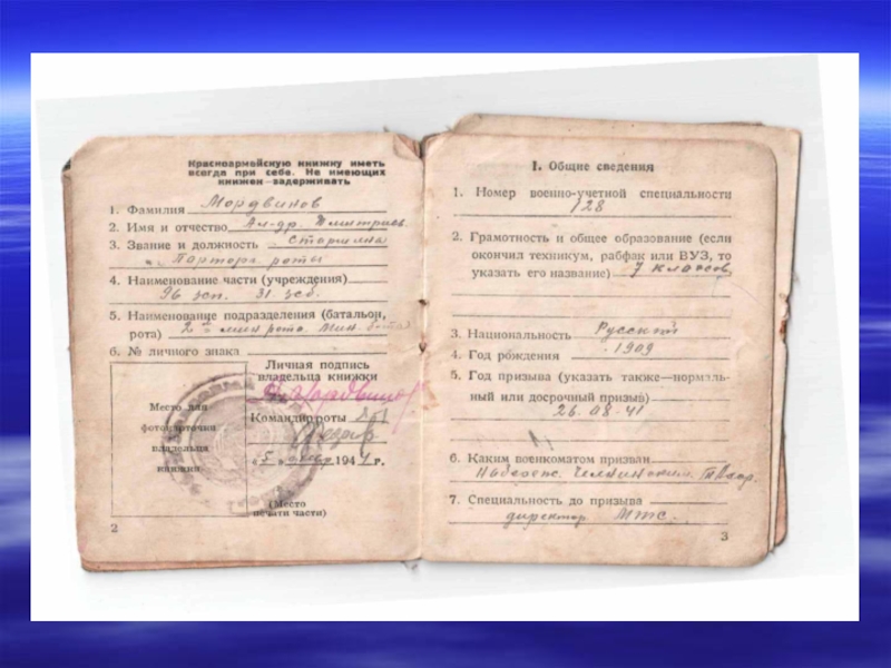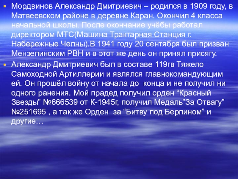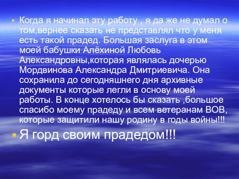 о том,вернее сказать не представлял что у меня есть такой прадед. Большая заслуга в этом моей бабушки Алёхиной Любовь Александровны,которая являлась дочерью Мордвинова Александра Дмитриевича. Она сохранила до сегодняшнего дня архивные документы которые легли в основу моей работы. В конце хотелось бы сказать ,большое спасибо моему прадеду и всем ветеранам ВОВ, которые защитили нашу родину в годы войны!!!