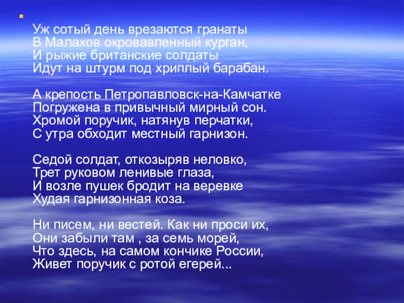 на штурм под хриплый барабан. А крепость Петропавловск-на-Камчатке Погружена в привычный мирный сон. Хромой поручик, натянув перчатки, С утра обходит местный гарнизон. Седой солдат, откозыряв неловко, Трет руковом ленивые глаза, И возле пушек бродит на веревке Худая гарнизонная коза. Ни писем, ни вестей. Как ни проси их, Они забыли там , за семь морей, Что здесь, на самом кончике России, Живет поручик с ротой егерей...