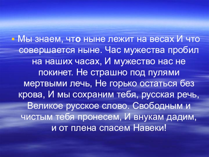 Час мужества пробил на наших часах, И мужество нас не покинет. Не страшно под пулями мертвыми лечь, Не горько остаться без крова, И мы сохраним тебя, русская речь, Великое русское слово. Свободным и чистым тебя пронесем, И внукам дадим, и от плена спасем Навеки!