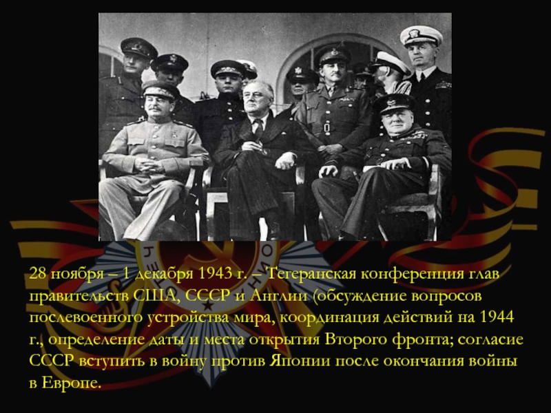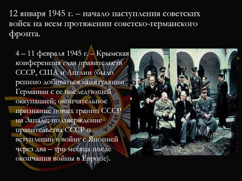 4 – 11 февраля 1945 г. – Крымская конференция глав правительств СССР, США и Англии (было решено добиваться капитуляции Германии с ее последующей оккупацией; окончательное признание новых границ СССР на Западе; подтверждение правительства СССР о вступлении в войну с Японией через два – три месяца после окончания войны в Европе).