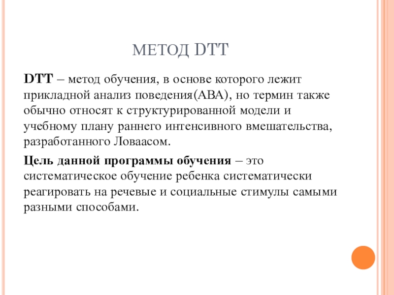 МЕТОД DTTDTT – метод обучения, в основе которого лежит прикладной анализ поведения(АВА), но термин также обычно относят к структурированной модели и учебному плану раннего интенсивного вмешательства, разработанного Ловаасом.Цель данной программы обучения – это систематическое обучение ребенка