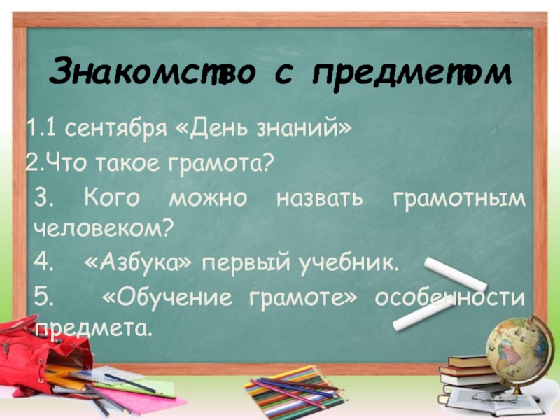 Знакомство с предметом1 сентября «День знаний»Что такое грамота?3. Кого можно назвать грамотным человеком?4. «Азбука» первый учебник.5. «Обучение грамоте» особенности предмета.