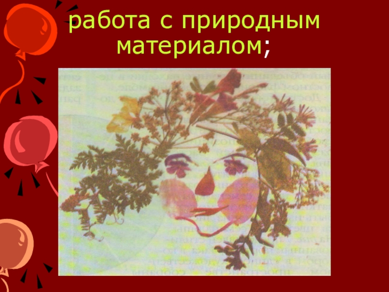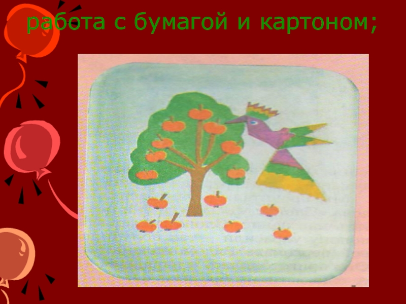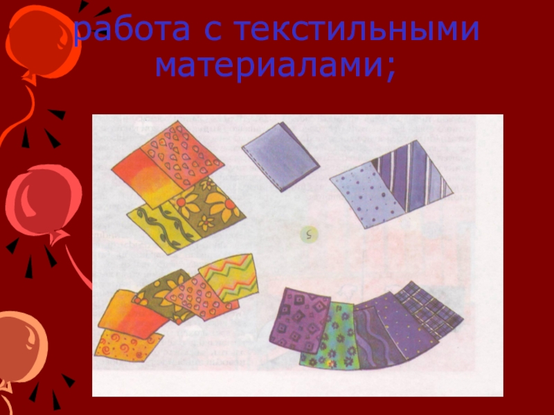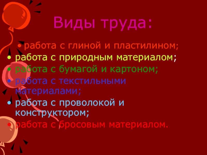 Виды труда:работа с глиной и пластилином;работа с природным материалом;работа с бумагой и картоном; работа с текстильными материалами;работа