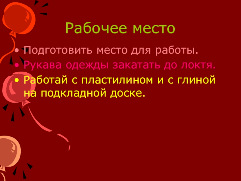 Рабочее местоПодготовить место для работы.Рукава одежды закатать до локтя.Работай с пластилином и с глиной на подкладной доске.