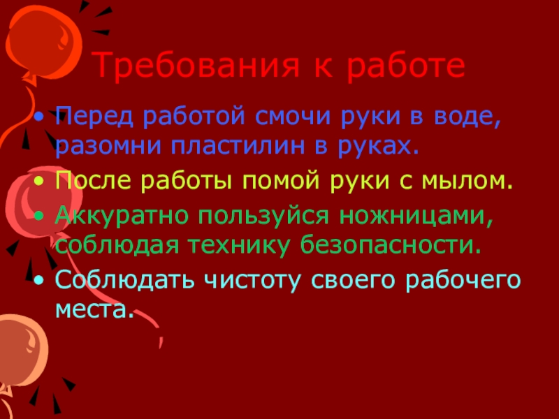 Требования к работеПеред работой смочи руки в воде, разомни пластилин в руках.После работы помой руки с мылом.Аккуратно