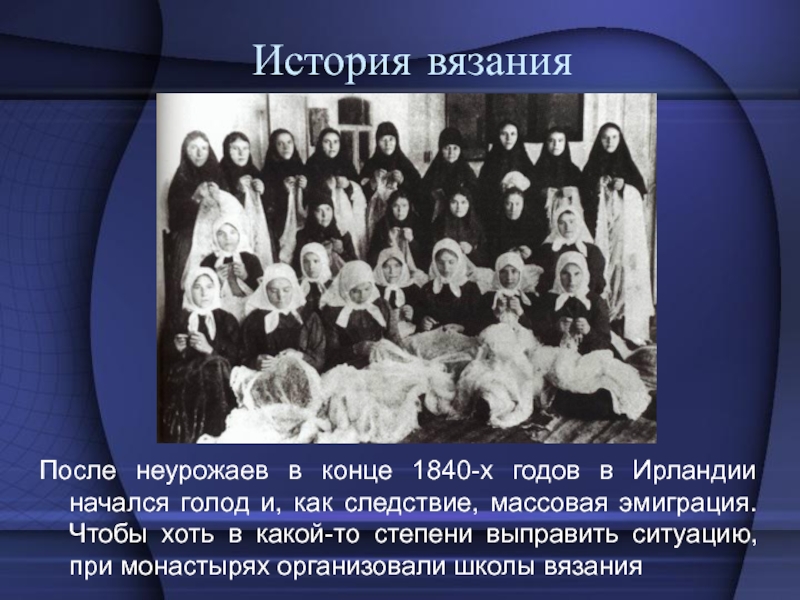 История вязанияПосле неурожаев в конце 1840-х годов в Ирландии начался голод и, как следствие, массовая эмиграция. Чтобы