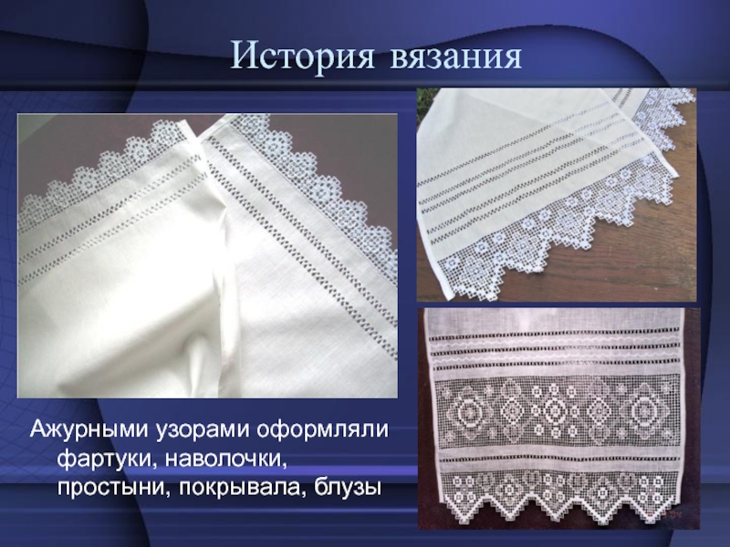 История вязанияАжурными узорами оформляли фартуки, наволочки, простыни, покрывала, блузы