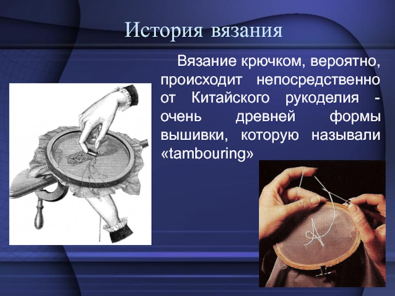 История вязания    Вязание крючком, вероятно, происходит непосредственно от Китайского рукоделия - очень древней формы