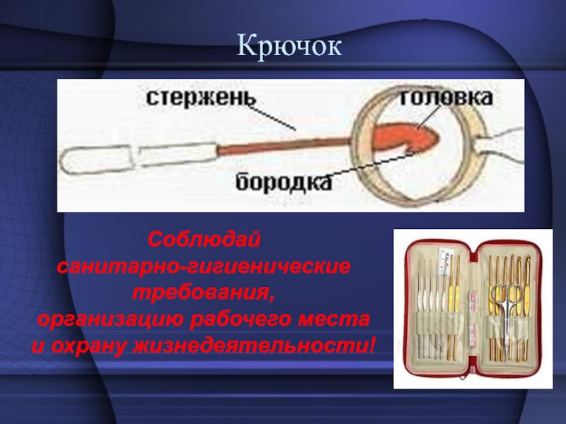 Крючок Соблюдай санитарно-гигиенические требования,организацию рабочего места и охрану жизнедеятельности!