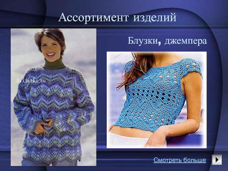 Ассортимент изделийБлузки, джемпераСмотреть больше