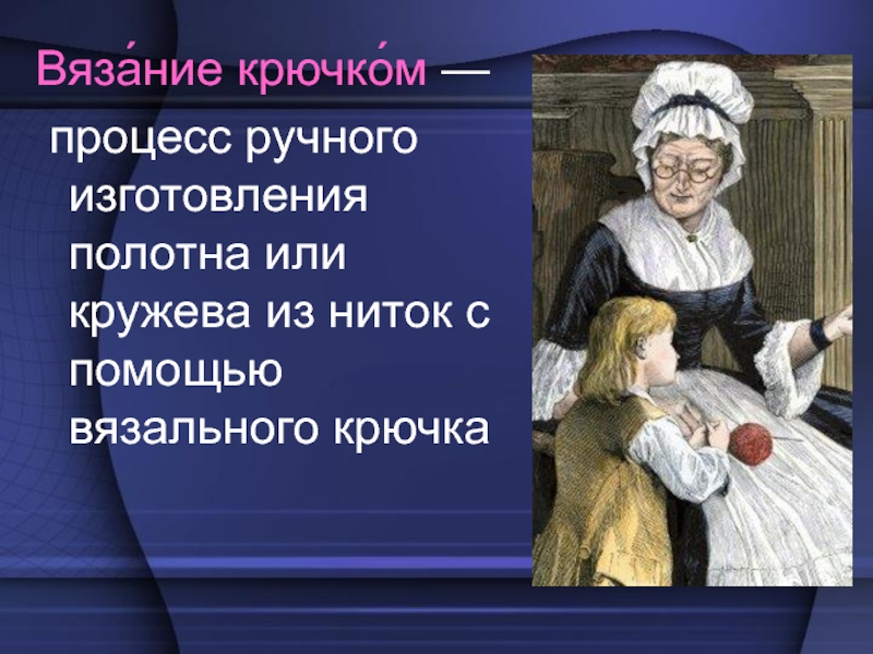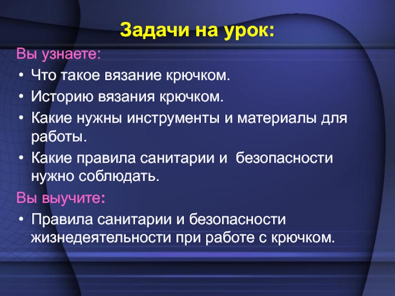 Задачи на урок:Вы узнаете:Что такое вязание крючком.Историю вязания крючком.Какие нужны инструменты и материалы для работы.Какие правила санитарии