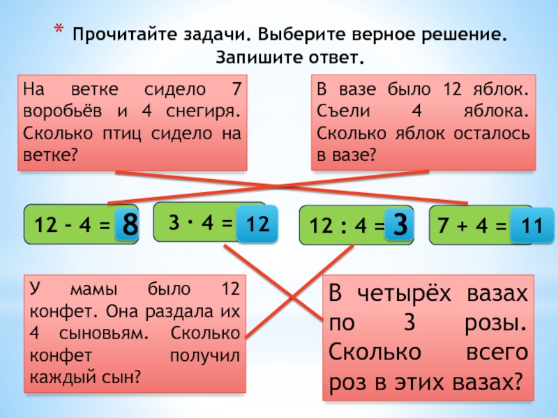 В вазе было 12 яблок. Съели 4 яблока. Сколько яблок осталось в вазе?