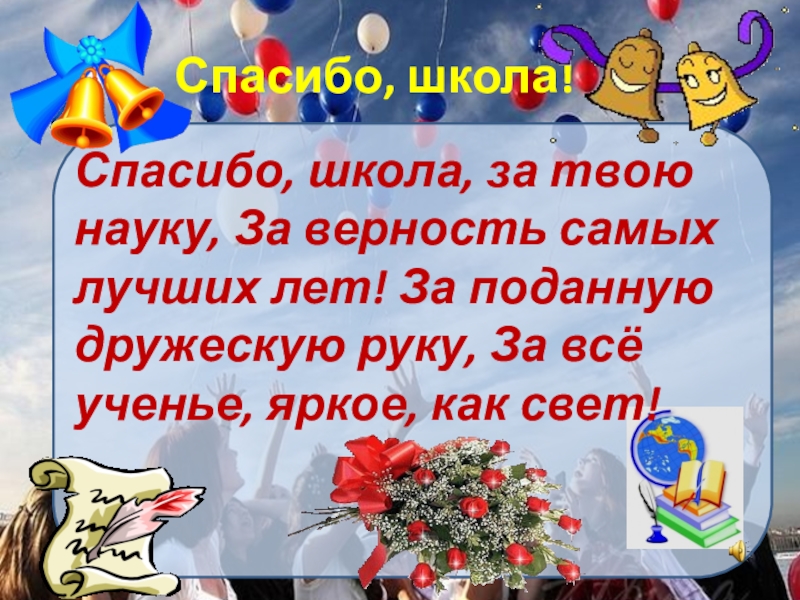 Спасибо, школа!Спасибо, школа, за твою науку, За верность самых лучших лет! За поданную дружескую руку, За всё