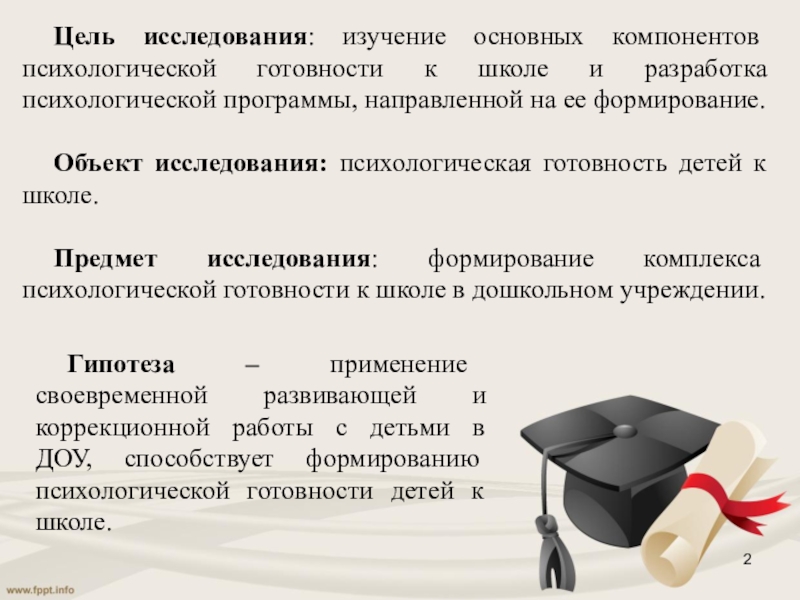 Гипотеза – применение своевременной развивающей и коррекционной работы с детьми в ДОУ, способствует формированию психологической готовности детей к школе.