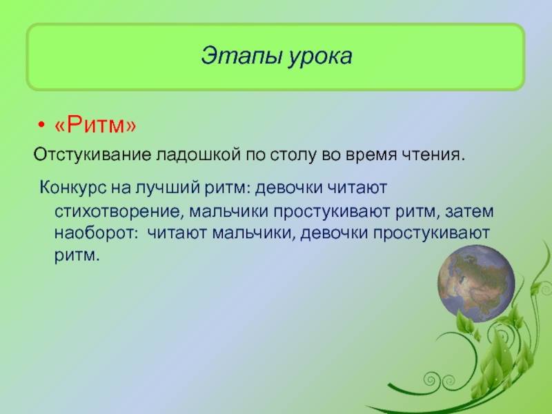 ритм: девочки читают стихотворение, мальчики простукивают ритм, затем наоборот: читают мальчики, девочки простукивают ритм.