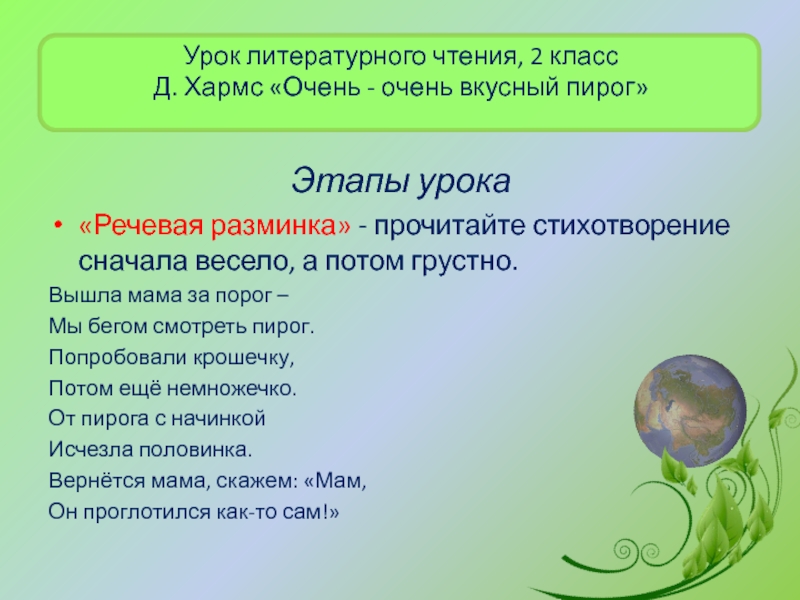 передачи ученику готового знания. Ведь они сами «додумываются» до решения ключевой проблемы урока и сами могут объяснить, как действовать в новых условиях. Так на этапе «Речевая разминка» обучающимся дается небольшое стихотворение, которое они должны прочитать несколько раз с различными видами заданий.