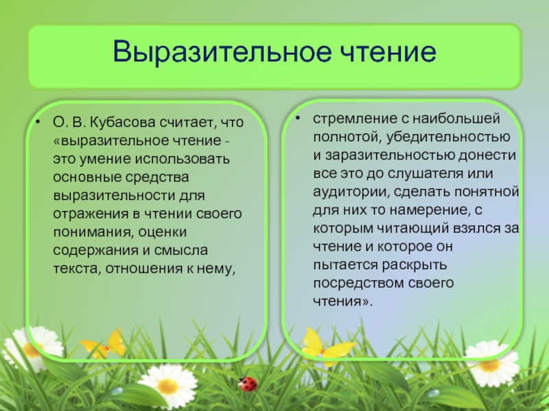 О. В. Кубасова считает, что «выразительное чтение - это умение использовать основные средства выразительности для отражения в чтении своего понимания, оценки содержания и смысла текста, отношения к нему,