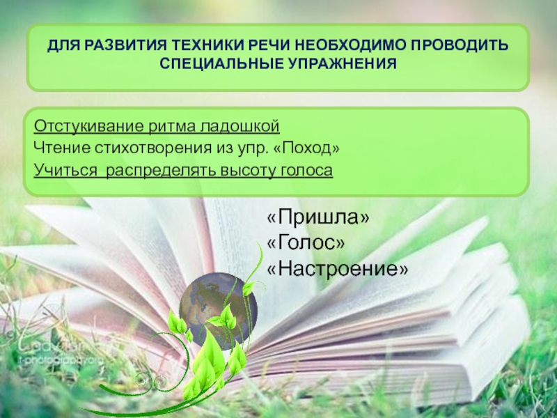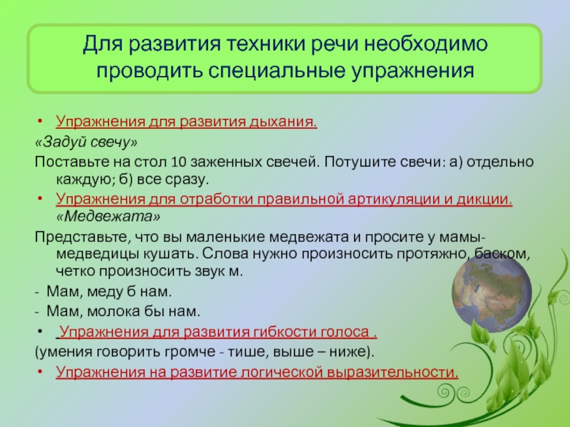Слайд 9Для развития техники речи необходимо проводить специальные упражнения